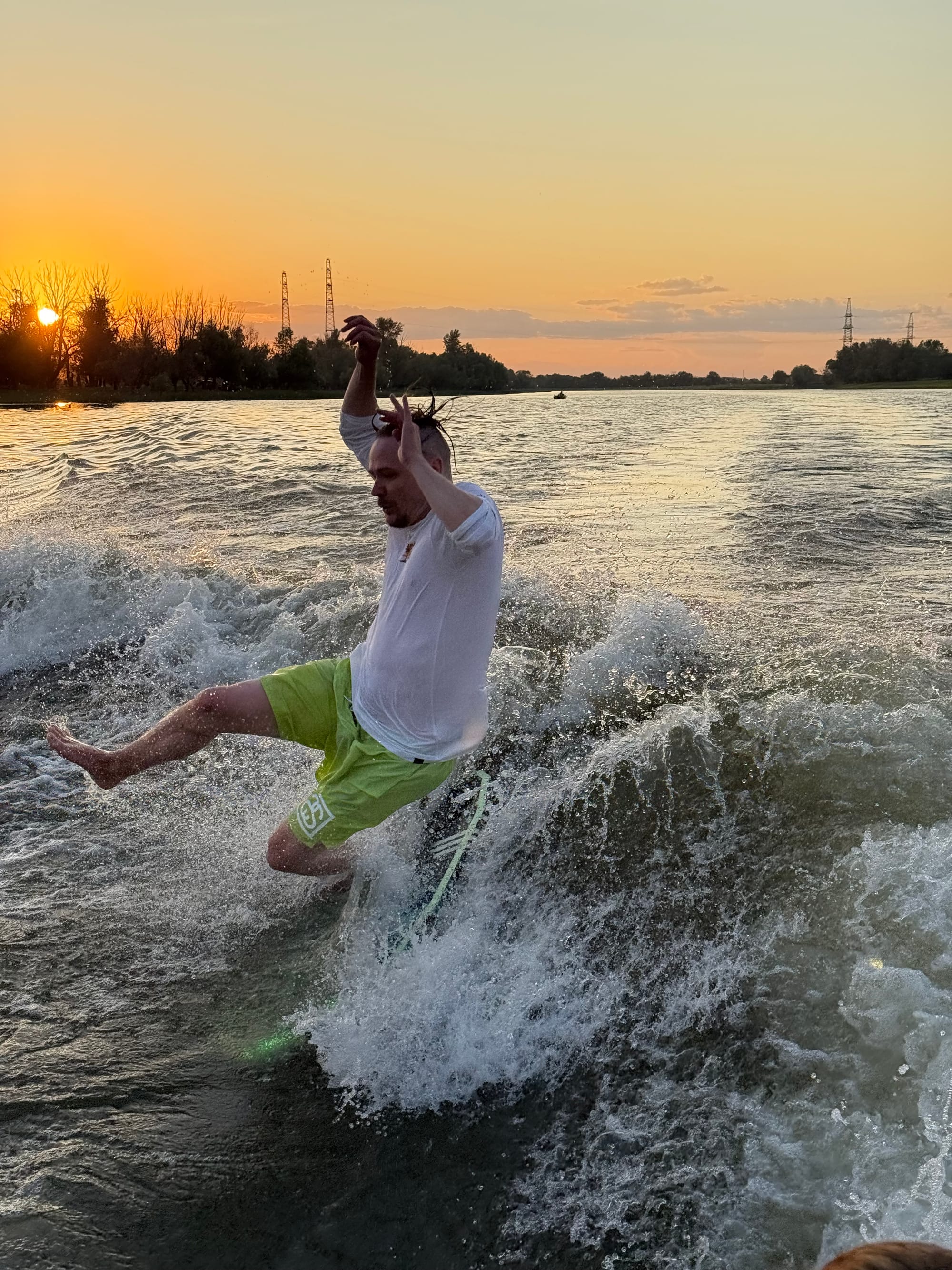 Мы немного передохнули, распаковали доски и поехали на нашу вечерне-закатную каталку на Nautique SUPER AIR 210. Нам очень хотелось как то подсветить доски, чтобы это выглядело красиво на фото и видео, но к сожалению получилось только "заколхозить" местную гибридную доску. Тем не менее мы прекрасно провели время.